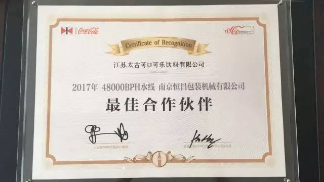 7月4日,江蘇太古可口可樂有限公司舉行了一場盛大的“新水線運營揭幕儀式”。作為該項目后段包裝總包商,南京恒昌包裝機械有限公司獲邀參加儀式,并得到了太古可樂的高度肯定,獲得“最佳合作伙伴”殊榮!